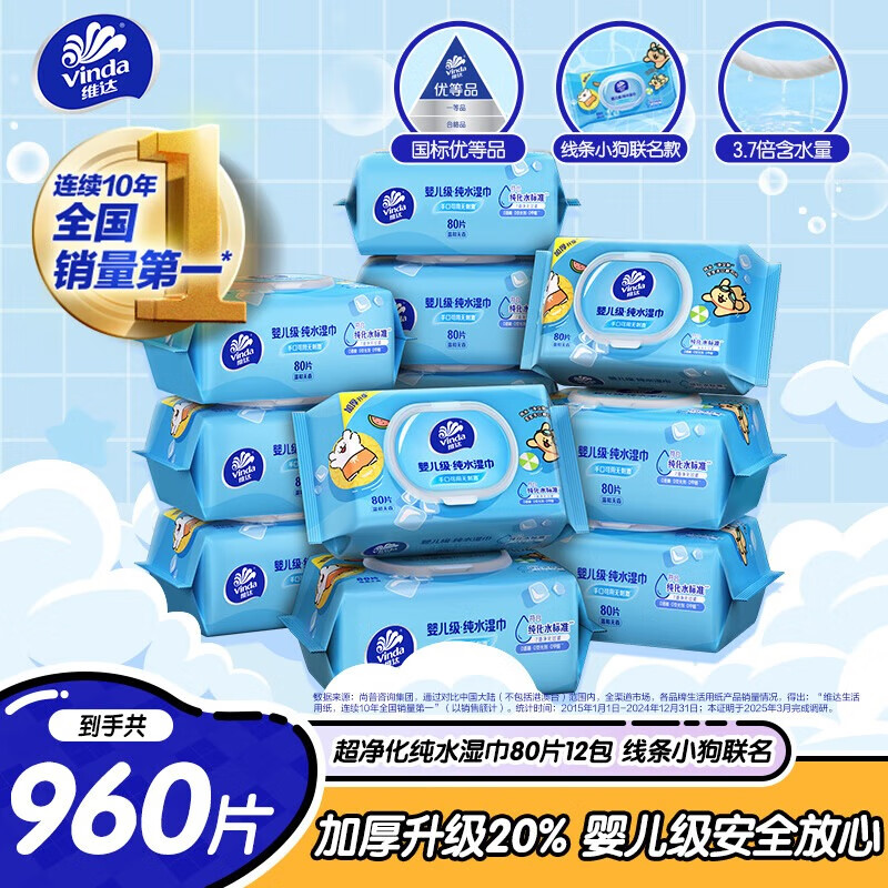 维达(Vinda)超净化纯水湿巾 80片*12包 线条小狗联名 婴儿湿巾手口可用湿纸巾