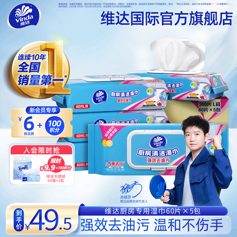 维达(Vinda)厨房湿巾60片装 去油去污湿纸巾 吸油抽取式带盖 家庭优惠装 1层 60片*5包