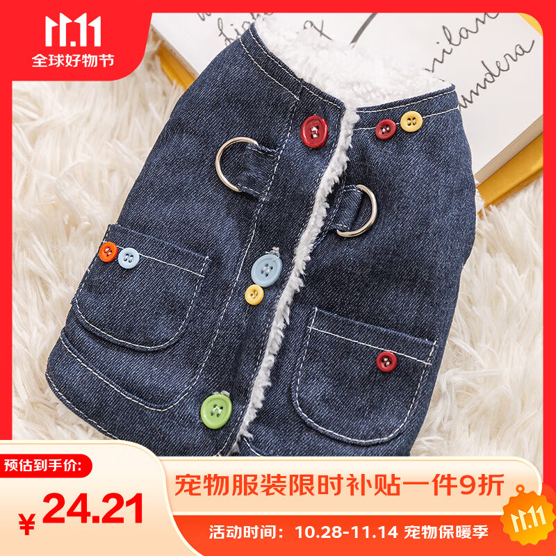 嬉皮狗(hipidog)彩色扣子冬季加绒加厚保暖狗狗衣服牛仔马甲泰迪猫咪棉衣宠物服饰 深邦迪蓝(可牵引) L 建议体重8-11斤
