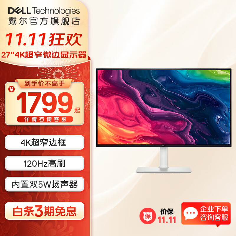 戴尔(DELL)27英寸4K显示器 超高清 IPS广色域 内置扬声器 旋转升降 超窄微边显示器屏幕办公娱乐设计显示器 【新品】120Hz S2725QS 官方标配 含3年原厂上门更换服务