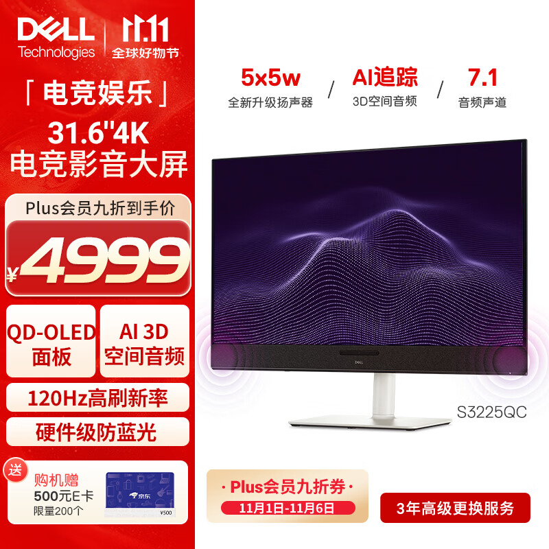 戴尔(DELL)31.6英寸4K QD-OLED电竞游戏影音大屏显示器120Hz 0.03ms HDR400 硬件防蓝光 5*5W音箱 S3225QC