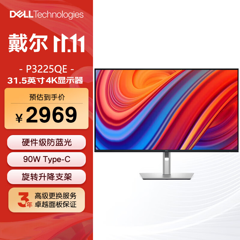 戴尔(DELL)31.5英寸4K办公显示器 100Hz IPS Type-C 90W反向充电 防蓝光 旋转升降 P3225QE