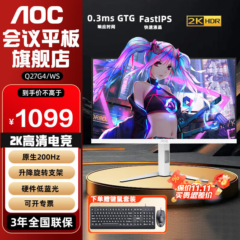 AOC27英寸2K 硬件低蓝光护眼 FastIPS HDR400 升降旋转电竞显示器 白色Q27G4/WS/2K/原生200HZ
