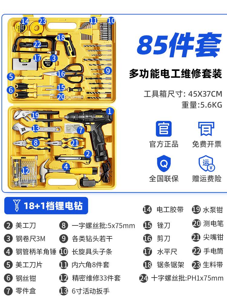 DELI得力工具箱家用套装多功能五金工具大全电工专用家庭维修组合 得力-锂电钻85件套装2023豪华家