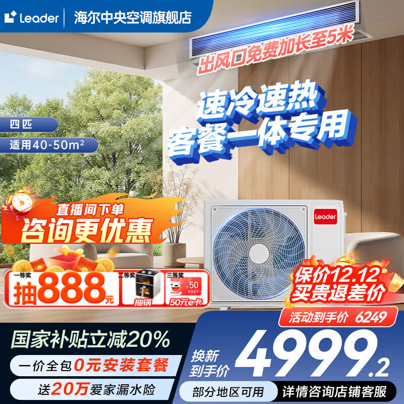 海尔智家出品【国家补贴立减20%】元气3匹风管机中央空调一拖一家用中央空调一级能效全直流变频 4匹 一级能效 元气Plus超省电【客餐厅大空间】
