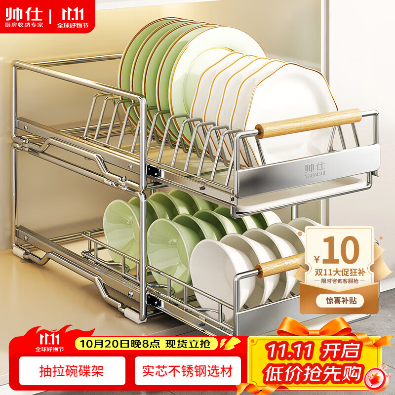 帅仕(shuaishi)厨房抽拉置物架橱柜拉篮碗碟架碗盘置物架不锈钢沥水碗架收纳架
