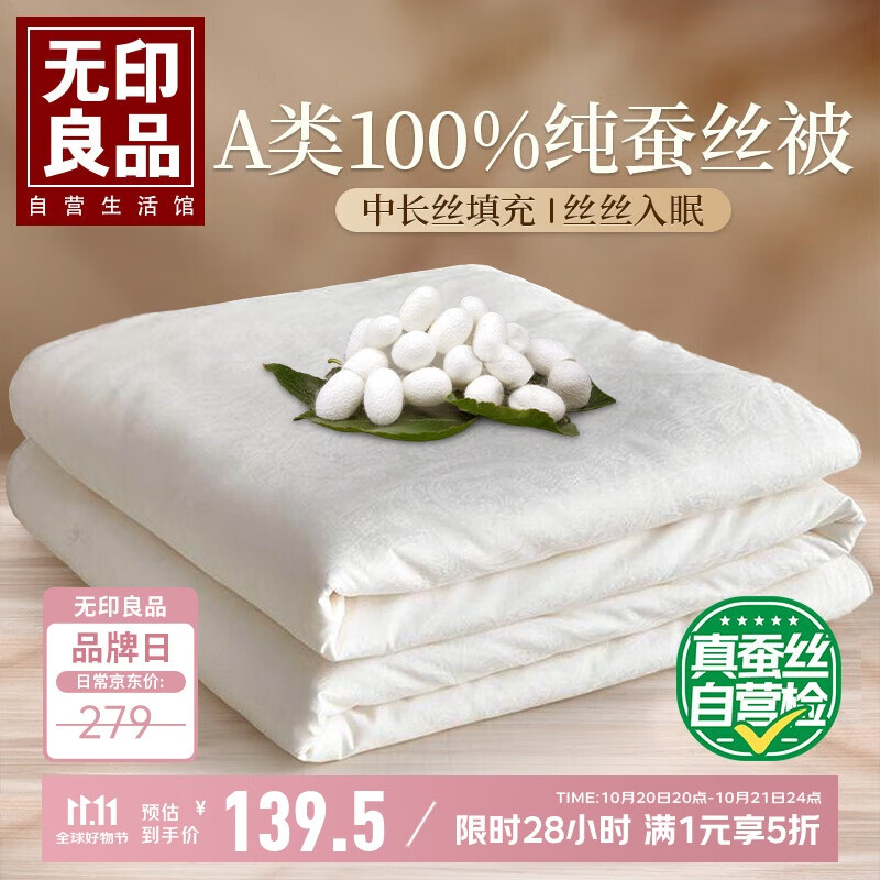 无印良品A类100%蚕丝被中长丝秋冬季被子单人空调被芯 150*200cm约5斤