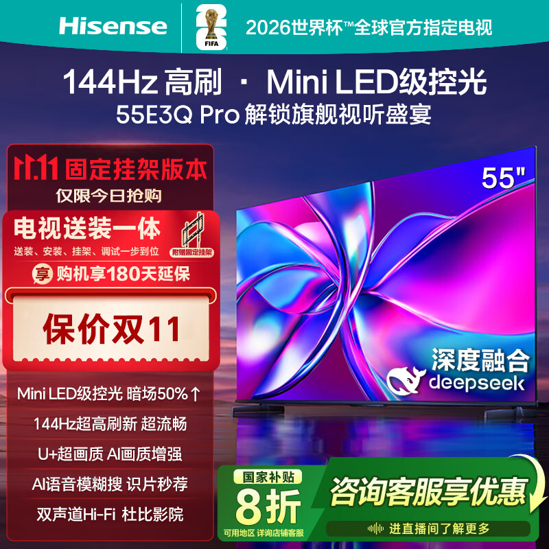 海信电视55E3Q Pro【送装一体-固定挂架】55英寸 144Hz MiniLED级 3G+64G 一级能效国家补贴以旧换新